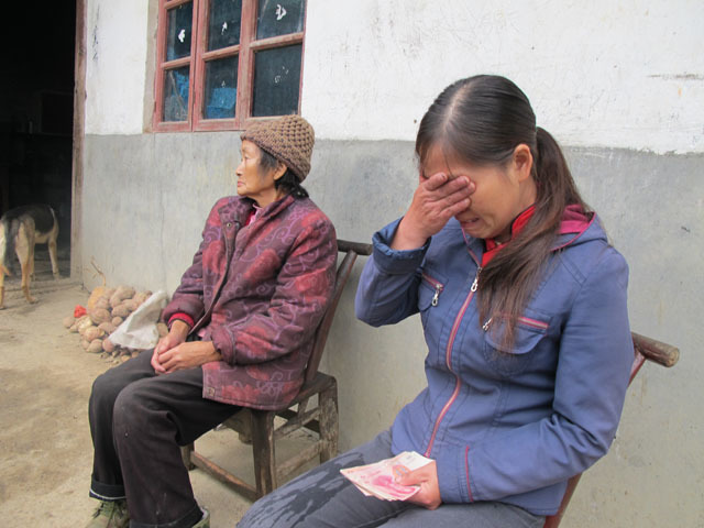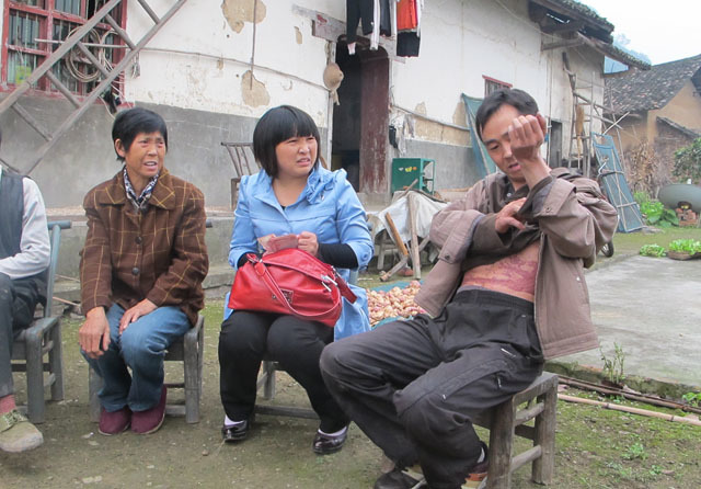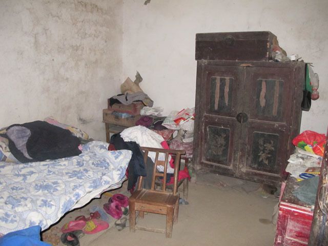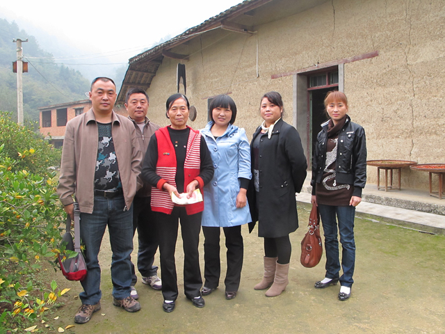 李林岚(回访):走进这个孩子的家,真的有些惨不忍睹,屋子里看不到一件像样的家具,腿脚不灵便的奶奶拄着拐杖坐在稻场边,女主人听到有客人来了,连忙让我们坐,我跟她打招呼,跟她笑,她好像没有多大的反应,我跟着她进了厨房,看到她正颤颤巍巍地在给我们摸索着泡茶,原来她视网膜脱落,根本就看不清楚东西,我们把助学款交给她,让她在表上签字,尽管我和刘书记把她的手拉到指定的地方,她还是把自己名字的最后一个字写到了她的腿子上。唉,看着这一家人,我真的无语。