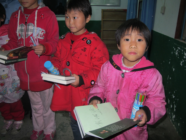 我们走访完9户孩子家庭,又从库区里坐机动船去湖对岸三十里路之外孩子们就读的学校看望了所有这些受资助的孩子们,他们分布在宝塔中心学校、宝塔小学、庄溪小学、镇机关幼儿园四所学校里,我们分别向他们的校长和老师们了解了学生在校情况。然后,把爱心人士捐赠的图书和文具发放给孩子们。