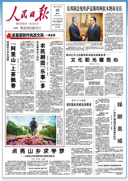 本网讯 2011年9月25日,人民日报头版报道了长阳花坪小学教师刘发英老师的助学事迹,标题为《点亮山乡求学梦》,以下是截图和全文。http://paper.people.com.cn/rmrb/html/2011-09/25/nw.D110000renmrb_20110925_8-01.htm