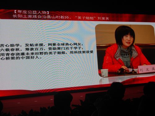 组委会给她的颁奖词是:苦心助学,发帖求援,网聚全球热心网友;六载春秋,筹款百万,资助寒门近千学子;用青春浇灌未来田野的英子姐姐,用科技架设爱心桥梁的中国好人。