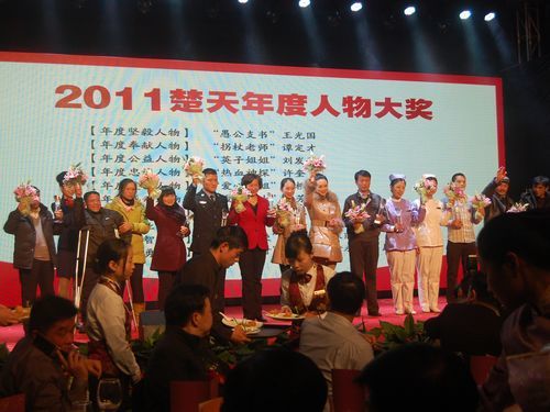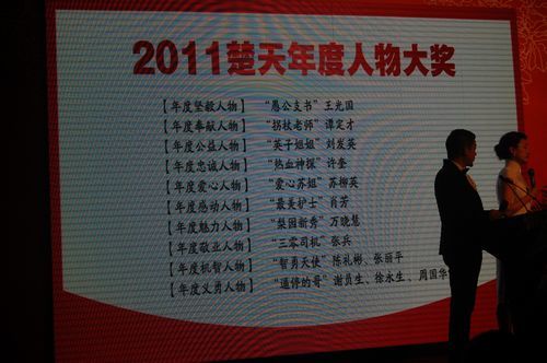 昨晚,由湖北日报、楚天都市报、湖北金报、荆楚网、腾讯大楚网联合举办的"2011楚天年度人物大奖"在武汉楚天粤海国际大酒店三楼楚天宫隆重举行颁奖盛典。