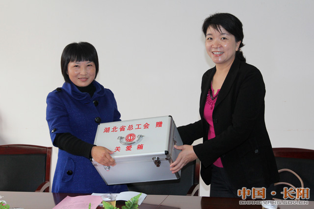 十八大党代表刘发英接受省总工会赠送的关爱箱