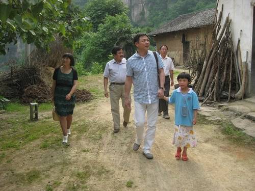 图为英子姐姐和广东爱心助学好人王伟森先生来到周坪小学走访贫困学生家庭