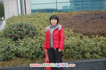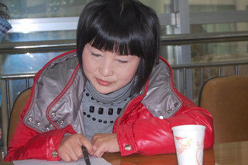 在热烈的掌声中,一位戴着眼镜,穿红色棉袄的女生抱着一个小盒子走到台上,走到英子姐姐和主持人武艳中间。武艳把话筒伸到她面前,对她说:“你向观众做一下自我介绍好吗?”