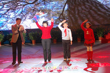 英子姐姐是第八位出场的。大屏幕播放完介绍她事迹的短片后,随着主持人龚年淼的礼请,她走下舞台底部右边铺着红地毯的台阶,挥手致意。追光灯下,她的呢子短上衣火红惹眼,充满了喜气。她走到舞台中央站定,向现场观众鞠躬施礼。