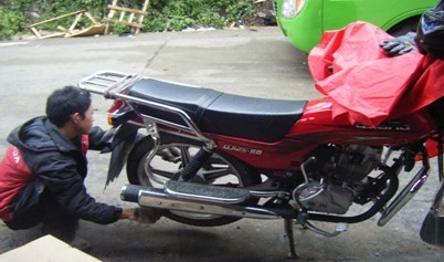 两台摩托车在蜿蜒盘旋的公路上曲线上升,海拔越来越高,气温越来越低,雨还在不懂事地下着,车子也给我们开了一个不大的玩笑——车胎爆了,可我们没有一个泄气的,强行骑行了两公里路才找到了修车师傅,换好车胎继续前进。
