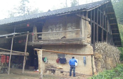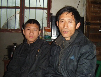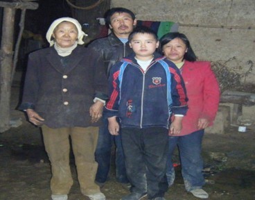 当我们爬到田周乐同学家的道场时,呈现在我们面前的是半边瓦房,因为拆去了一边的墙,所以,用破旧的薄膜钉着好为这个家遮风挡雨。房子的外面搭了个用来放杂物的棚,我们通过坑坑洼洼的阶岩,进了屋,屋里很暗,以至我们半天才看到屋里情境,黑黑的板壁上,一张张金黄的奖状那么醒目。四周角落里到处堆着杂物,光线透过稀稀拉拉的楼板照进堂屋,堂屋的左边是周乐家的火房和卧房,右边的房间一面是墙,一面就用薄膜和板子钉着,里面放着一堆土豆,还有一些农具。堂屋那已是斑驳漆黑的板壁后面是三间低矮黑暗的小房间,是他74岁高龄的奶奶住的。由于我们事前没有通知学生,田周乐和父亲都不在家,再加上孩子的鞋子破得穿不成了,就和孩子步行去柿贝买鞋子去了,所以我们去时,就他奶奶和母亲在家,他的奶奶依然用泪水迎接了我们。看到我们冻得直发抖,老人连忙在那间低矮的火堂里生了火。我们向她的奶奶了解了相关情况:田周乐一家四口人,奶奶74岁了,已经丧失劳动能力;母亲是聋哑人,智力下;父亲在27年前抬木料时受了伤,造成左眼失明,右眼视力下降,身体素质差,体弱多病,干不了重体力活,全家人都靠他种三亩多田维持生活,田周乐是全家的希望,他学习成绩很好,多次被表彰为"优秀学生干部"、"学习标兵"等荣誉称号。由于家庭困难,步行40里路上学,让老师都感到痛心。我们电话约好了等田周乐父子回家后照几张照片,然后匆忙离开,走访其他学生。
