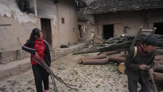 我们不禁从心里称赞这孩子的懂事体贴。奶奶的身体似乎尚可,但是我注意到她的双眼下有两道黑色的印子,好像是长期营养不良和休息不足导致的,她家道场外堆放着不少这样的柴禾,周奶奶告诉我们说,周迎春的爸爸早年因为事故左眼被炸得完全失明了,后来做了手术,但是却因为手术不彻底而影响到脑部神经,所以大脑有点不太正常,长年沉溺于喝酒,如今的身体已经糟糕到极致,几乎不能起床,说这话的时候周迎春的爸爸还在阁楼上的床上躺着,听到我们来了,才勉强支撑着起身,至于她的妈妈,早年因为丈夫的残疾,再加上脑筋的不正常承受了很多苦难,最终选择离开这个家,只是每年来看她一次,并带给她少量的生活费,据周迎春说去年过年她妈妈来看她了,并且给了她一百多块钱的零花钱。平时她的生活费都靠奶奶在山上捡柴禾然后背回来再卖给别人换点钱,一家三口人的生活就指望着六十多岁的奶奶来支撑着。我们走的时候,奶奶无限凄楚,说,这两年身体越来越差了,感觉自己已经快要撑不下去了,只希望这个孙女快快长大,好叫自己也放心些……